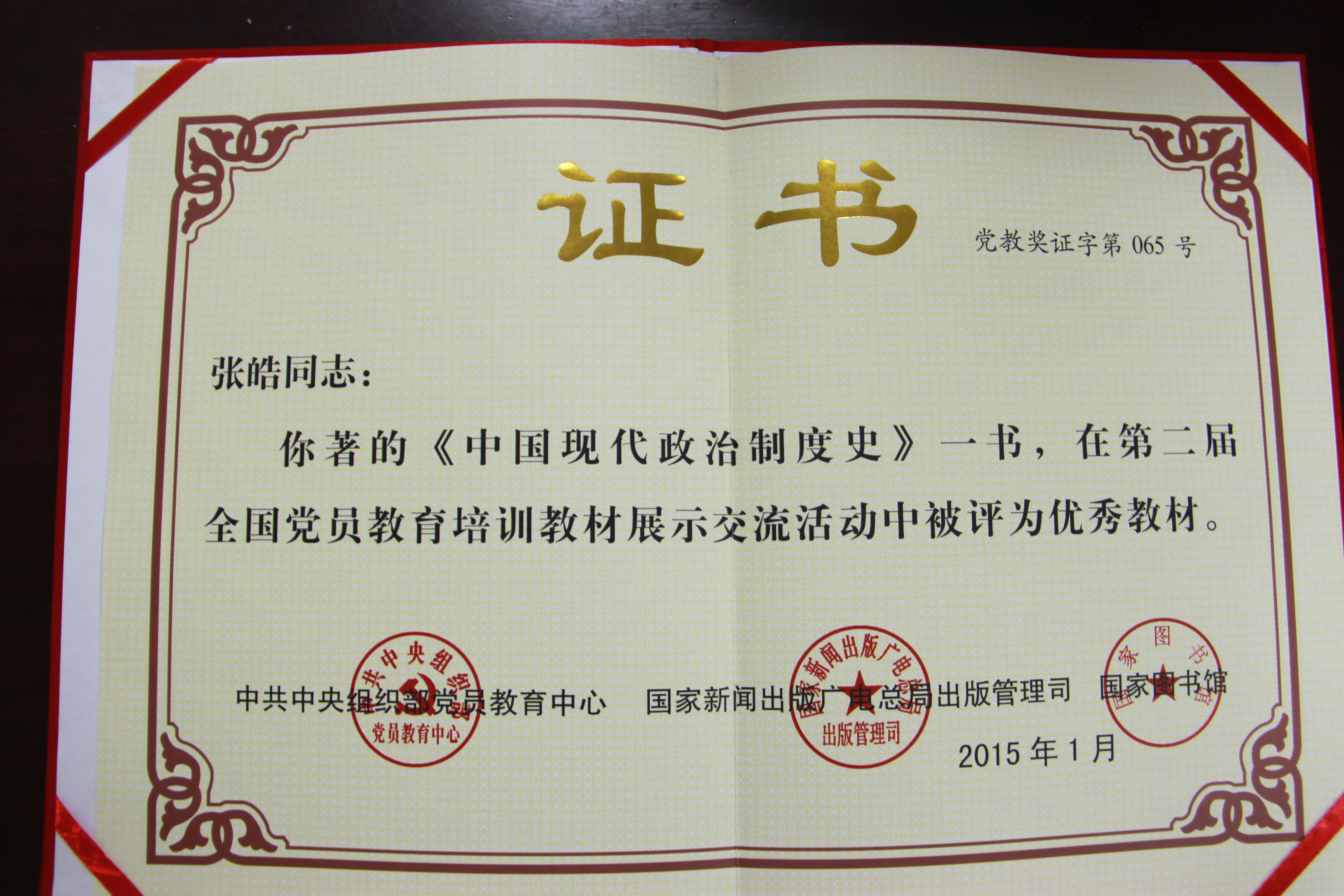 近悉,我院张皓教授所著的《中国现代政治制度史》在中第二届全国党员教育培训教材展示交流活动中被评为优秀教材。该奖项由中共中央组织部党员教育中心、国家新闻出版广电总局出版管理司、国家图书馆联合评出。