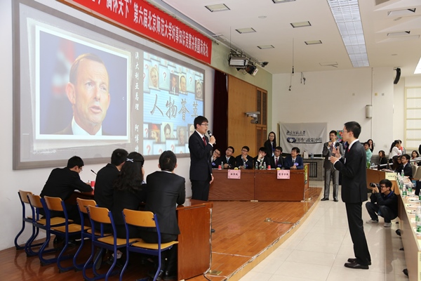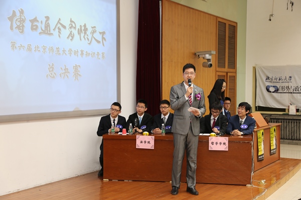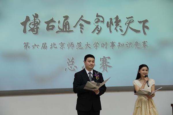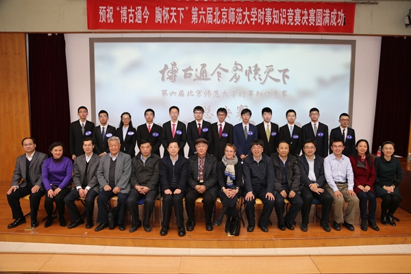 新葡萄8883官网AMG党委副书记刘利老师,党委宣传部新闻中心常务副主任、机关一总支书记李美仙老师,研究生工作处处长应中正老师,本科生工作处处长王洛忠老师,校团委书记袁慧老师,本科生工作处副处长隋璐璐老师,校电视台台长齐松老师,新葡萄8883官网AMG院长杨共乐老师,新葡萄8883官网AMG分党委书记耿向东老师,新葡萄8883官网AMG副院长姜海军老师,新葡萄8883官网AMG分党委副书记王卓凯老师,教育学部学生工作办公室主任刘立老师,法学院分党委副书记魏天经老师,政府管理学院分党委副书记郭智芳老师,新葡萄8883官网AMG中国近代史教研室教授李志英老师,政府管理学院国际关系专业教授李兴老师,新葡萄8883官网AMG世界近代史教研室庞冠群老师、贾珺老师,校研究会主席毕硕同学等嘉宾也出席了当晚的决赛。出席比赛的还有来自国际关系学院、清华大学、北京大学、南开大学、对外经贸大学和北京电子科技学院等高校时事研究团体的负责人。 因故未能出席参加活动的中央电视台著名新闻主播贺红梅老师给组委会寄来祝福,对师大学子的知识素养和综合能力给予高度肯定,并预祝“博古通今胸怀天下”活动圆满成功。